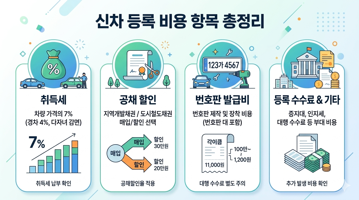 신차 등록 시 취득세 외에 지역개발채권(또는 도시철도채권)을 의무적으로 매입해야 합니다. 이 공채는 매입 즉시 할인 매도가 가능하며, 그 할인액만큼 실질 비용이 발생합니다.