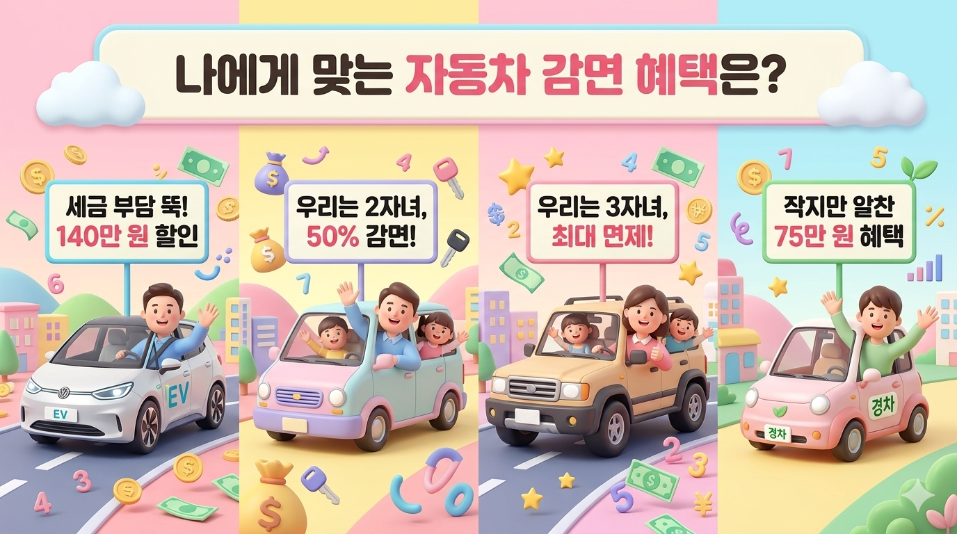 | 3자녀 이상 | 100% 면제 | 140만원 한도 | 6인 이하 승용차 1대 |